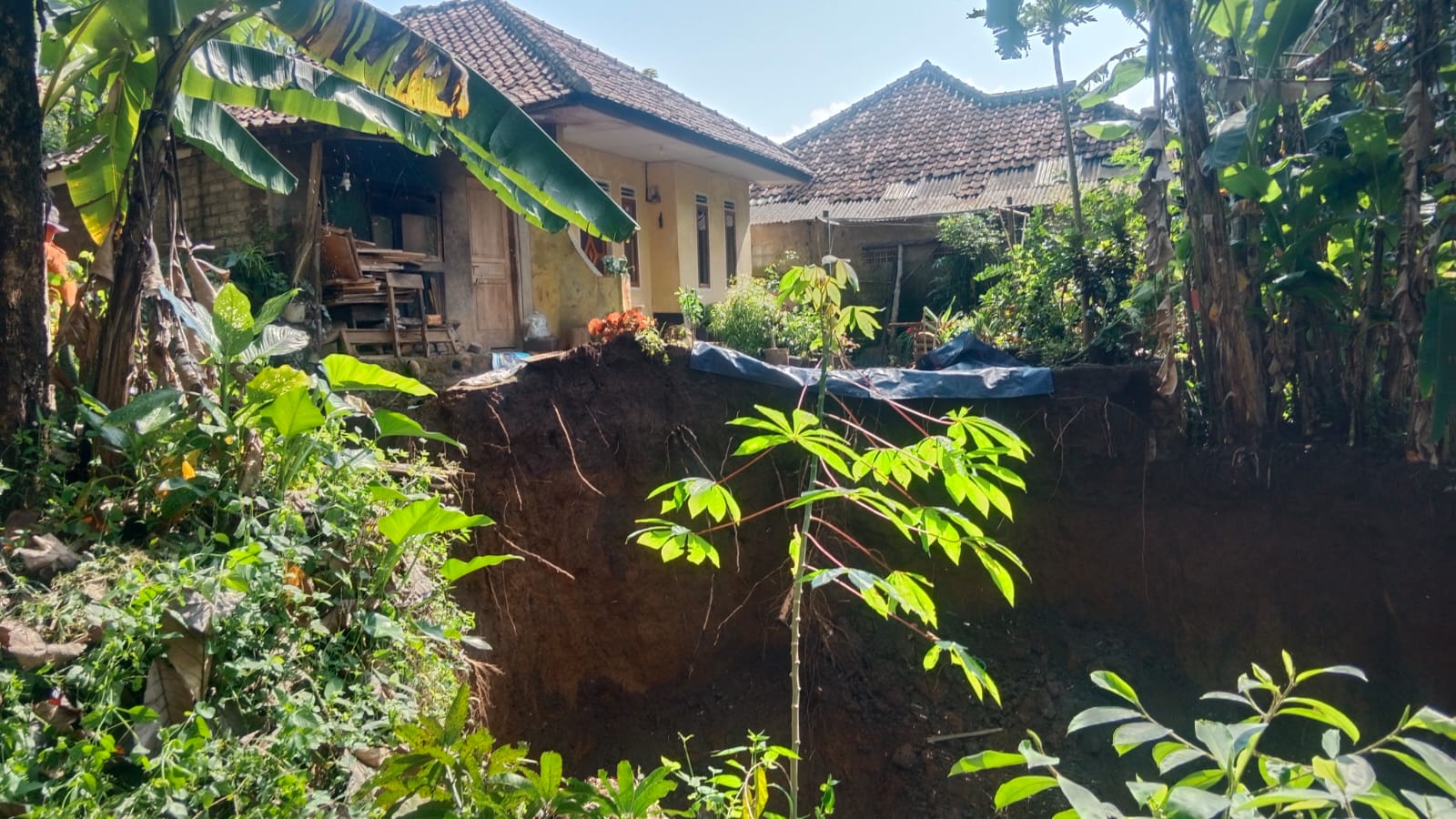 Longsor seluas 50 meter dengan kedalaman 15 s/d 20 meter berada di pemukiman penduduk. Ada dua rumah penduduk yg terdampak akibat longsor tersebut, salah satunya rumah milik Ibu Tati Suryati hampir kebawa longsor.