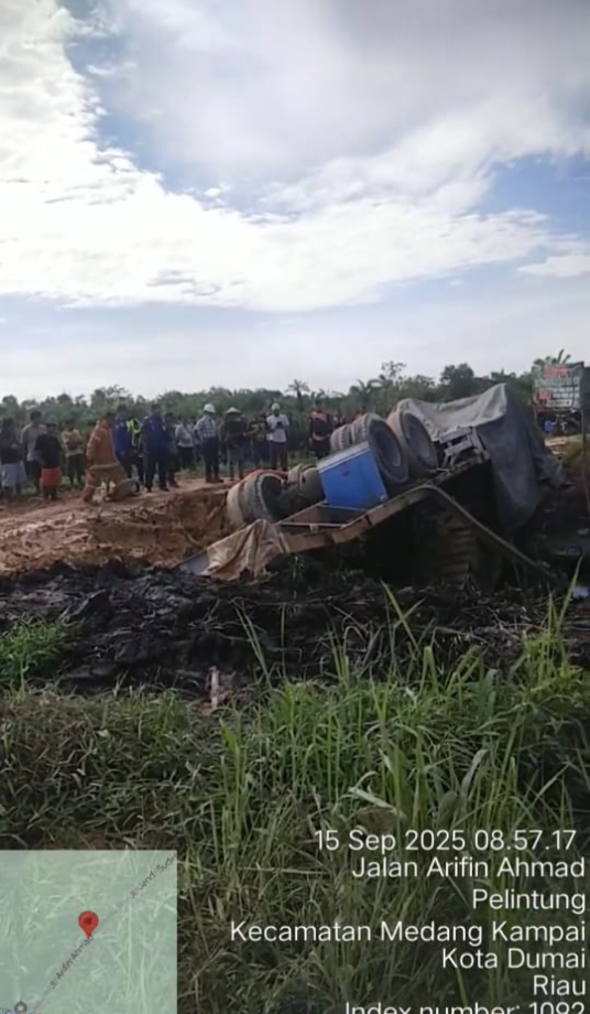 Truk tronton pengangkut 1 unit excavator terbalik di wilayah Selingsing,Kelurahan Pelintung,Kecamatan Medang Kampai, Kota Dumai.