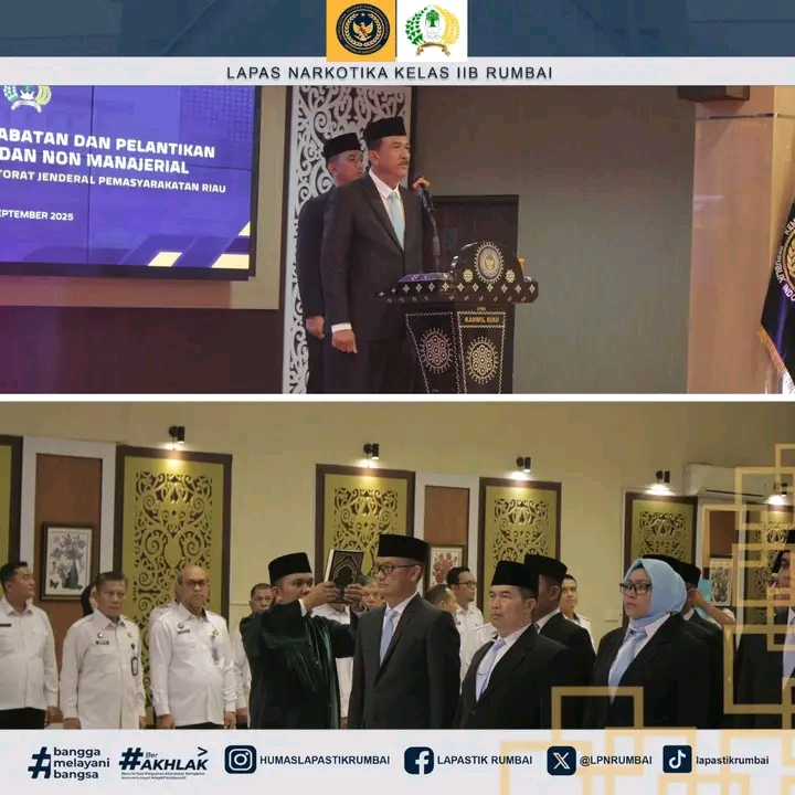 Kepala Kantor Wilayah Direktorat Jenderal Pemasyarakatan (Kanwil Ditjen PAS) Riau, Maizar, melantik sejumlah pejabat manajerial dan non manajerial di lingkungan pemasyarakatan wilayah Riau, Senin (29/09/2025).