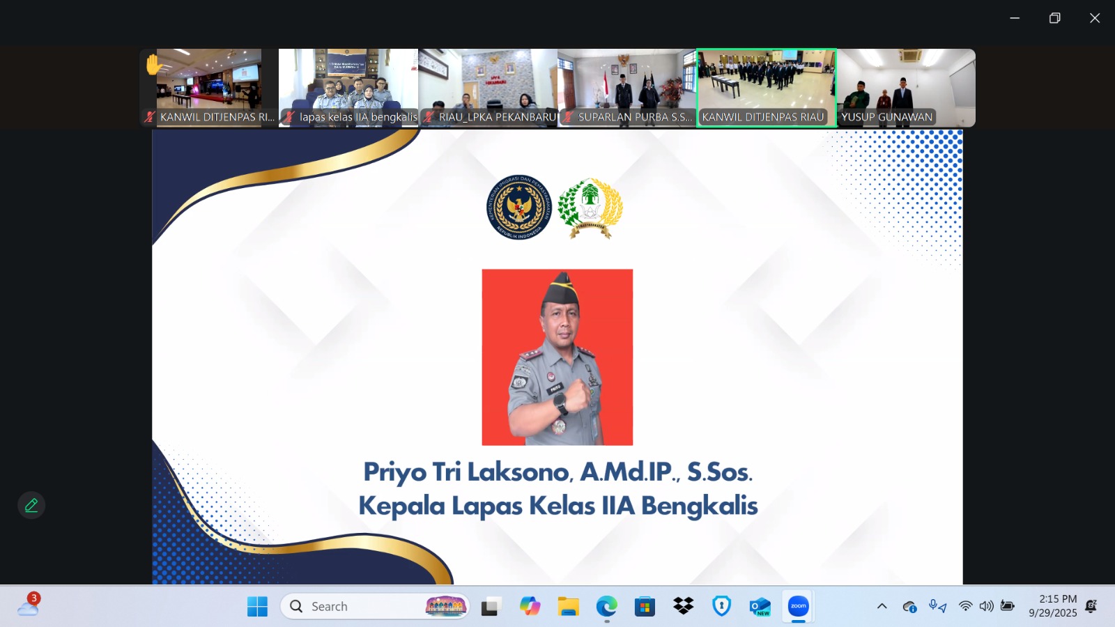 29 September 2025 β Lembaga Pemasyarakatan Kelas IIA Bengkalis mengikuti kegiatan Pelantikan dan Pengambilan Sumpah Jabatan di lingkungan Kantor Wilayah Direktorat Jenderal Pemasyarakatan Riau yang dilaksanakan pada hari ini. Kegiatan yang dipimpin langsung oleh Kepala Kantor Wilayah Direktorat Jenderal Pemasyarakatan Riau tersebut berlangsung di Pekanbaru dan diikuti secara virtual melalui aplikasi Zoom oleh jajaran Lapas Bengkalis.