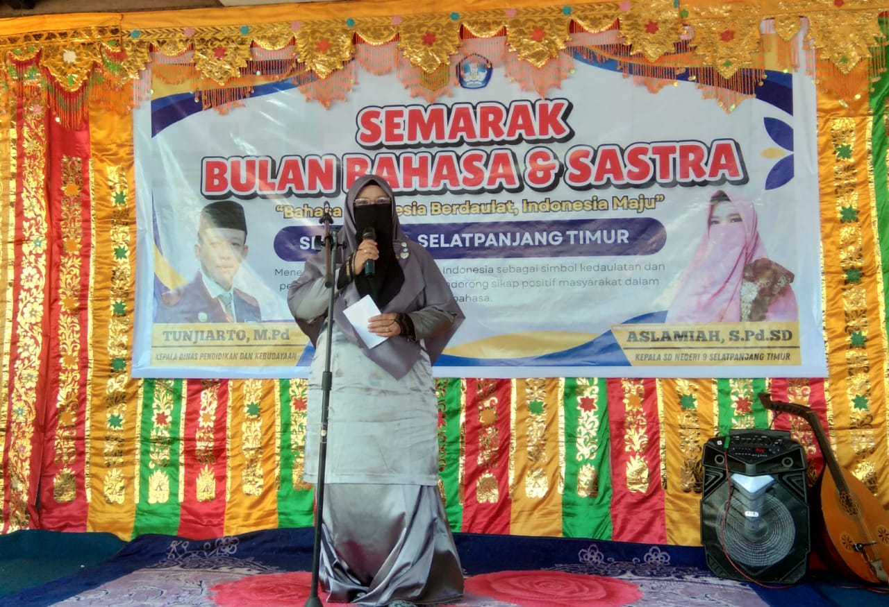 Dalam sambutannya, Kepala SD N 9 Selatpanjang Timur, Aslamiah, S.Pd., SD., mengatakan bahwa kegiatan Perayaan Bulan Bahasa ini merupakan wadah bagi para siswa di sekolah yang dipimpinnya untuk menyalurkan bakat dan minat dalam bidang seni, sastra, dan bahasa.