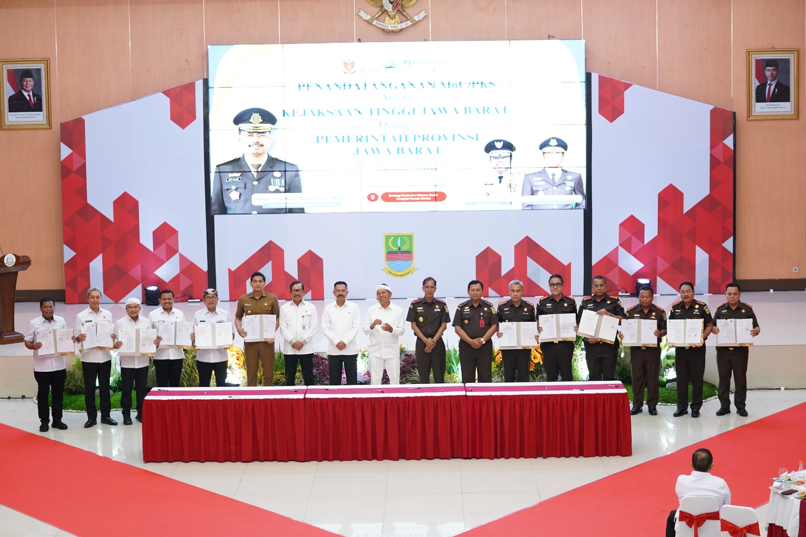 Kajati Jabar Dr. Hermon Dekristo, S.H., M.H beserta jajaran menandatangani MoU antara Kejaksaan Tinggi Jawa Barat (Kejati Jabar) dengan Gubernur Provinsi Jawa Barat Dedi Mulyadi dan seluruh Kepala Kejaksaan Negeri dengan Bupati/Walikota Se-Wilayah Jawa Barat acara tersebut diselenggarakan di Gedung Swantantra Wibawa Mukti Kabupaten Bekasi pada Selasa 4 November 2025.