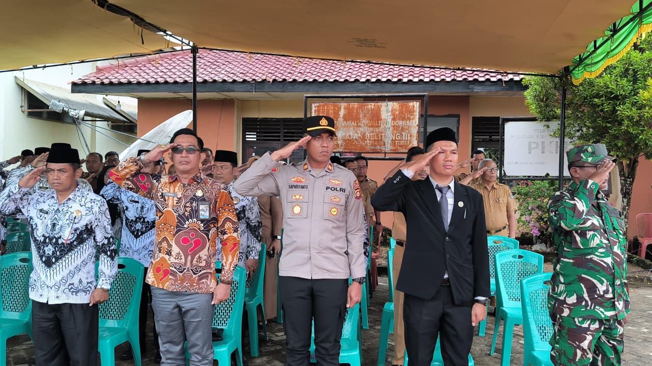 Belitang, OKU Timur – Kapolsek Belitang III, IPTU SAPARIYANTO, SH, menghadiri Upacara Peringatan HUT PGRI ke 80 dan Hari Guru Nasional 2025 di Lapangan Kantor Kecamatan Belitang III, Kabupaten Ogan Komering Ulu Timur, Selasa (25/11/2025). Upacara yang mengusung tema “Mari Kita Jaga Marwah Guru untuk mewujudkan Guru Hebat Indonesia Maju” ini dihadiri oleh sekitar 1000 peserta, termasuk Camat Belitang III, SANDRA BAKTI, SKM.MM, Danramil Belitang yang diwakili oleh Babinsa SERTU JULIANTO, serta para guru dan siswa dari Paud hingga SMA di wilayah Kecamatan Belitang III.