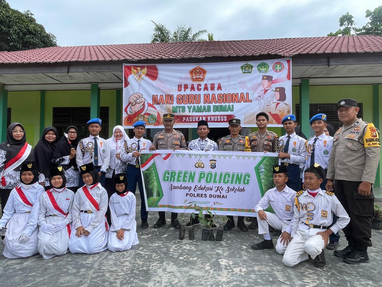 Polres Dumai melalui Polsek Bukit Kapur melaksanakan kegiatan Green Policing di MTs YAMAS Dumai, Kecamatan Bukit Kapur. Kegiatan ini meliputi penanaman pohon dan pemberian edukasi kepada siswa-siswi tentang pentingnya menjaga alam dan lingkungan sejak dini.