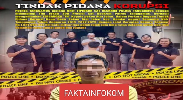 Polres Tanggamus melalui Unit Tindak Pidana Korupsi (Tipikor) Satreskrim, didampingi Tim Tekab 308 Presisi Satreskrim Polres Tanggamus, mengamankan FH, Kepala Pekon Atar Lebar, Kecamatan Bandar Negeri Semuong, Kabupaten Tanggamus.