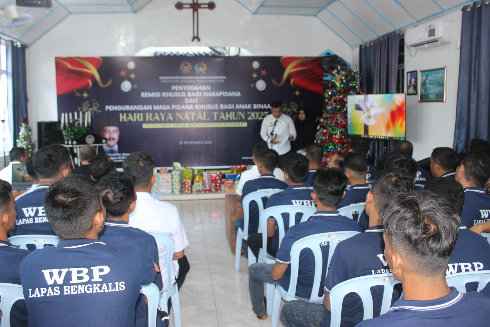 Acara diawali dengan pembacaan Surat Keputusan (SK) Remisi Khusus Natal Tahun 2025 yang dibacakan oleh Kepala Subseksi Registrasi Lapas Kelas IIA Bengkalis, Ahmad Rizky Fauzan Harahap. Selanjutnya dilakukan penyerahan Remisi Khusus Natal Tahun 2025 secara simbolis kepada dua orang perwakilan narapidana penerima remisi.