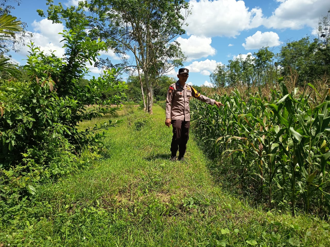 Bhabinkamtibmas Polsek Belitang III Bripka Dwi Kurnianto melakukan pendampingan penanaman tanaman jagung ketahanan pangan di lahan milik Masyarakat Desa Nusa Maju Kecamatan Belitang III, kamis (15/Januari/2026).